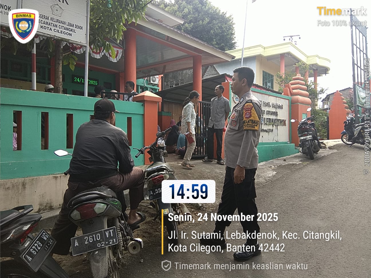 Bhabinkamtibmas Kelurahan Lebak Denok, AIPTU YUDI SETIAWAN, melaksanakan pengamanan dan monitoring bantuan langsung tunai dari Kementerian Sosial RI di Kantor Kelurahan Lebak Denok, Kecamatan Citangkil, Kota Cilegon, Senin (24/11/2025).
