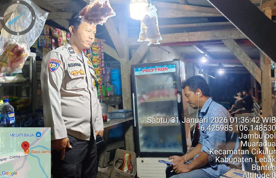 Seperti yang terlihat Petugas Patroli Polsek Cikulur Polres Lebak, Aipda Sujoko Melaksanakan Patroli Dialogis dan Sambang Satkamling ke Perkantoran,Sekolah,Pertokoan dan Perkampungan di wilayah Kecamatan Cikulur Kabupaten Lebak, baik yang sedang ronda malam maupun yg tidak ronda. pada Sabtu (31/01/2026) Dinihari.