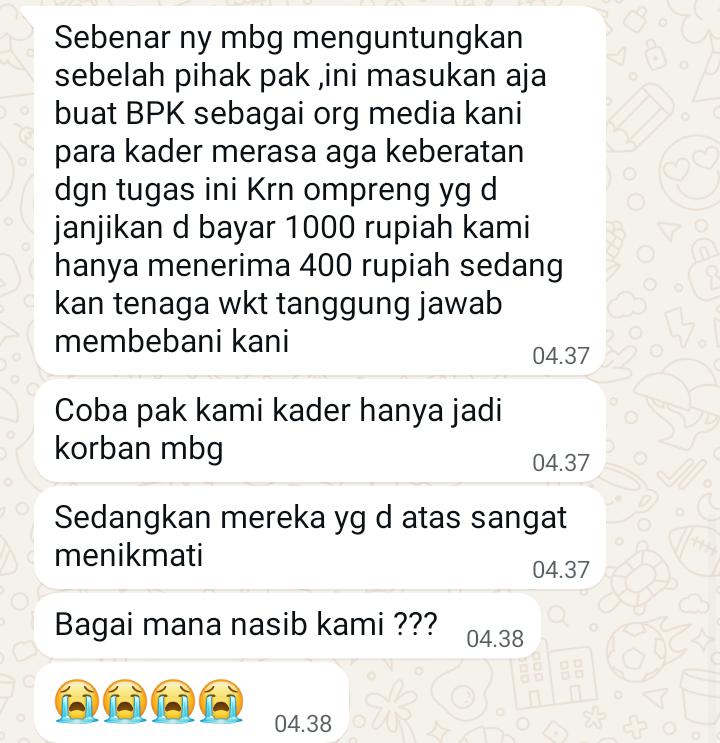 Berdasarkan informasi yang dihimpun dari sejumlah pihak di lapangan, salah seorang kader berinisial AS mengungkapkan adanya perbedaan antara nominal insentif operasional yang dijanjikan dengan realisasi yang diterima. Ia menyebutkan bahwa nilai yang semula diinformasikan sebesar Rp1.000 per porsi, pada praktiknya hanya diterima sebesar Rp400.