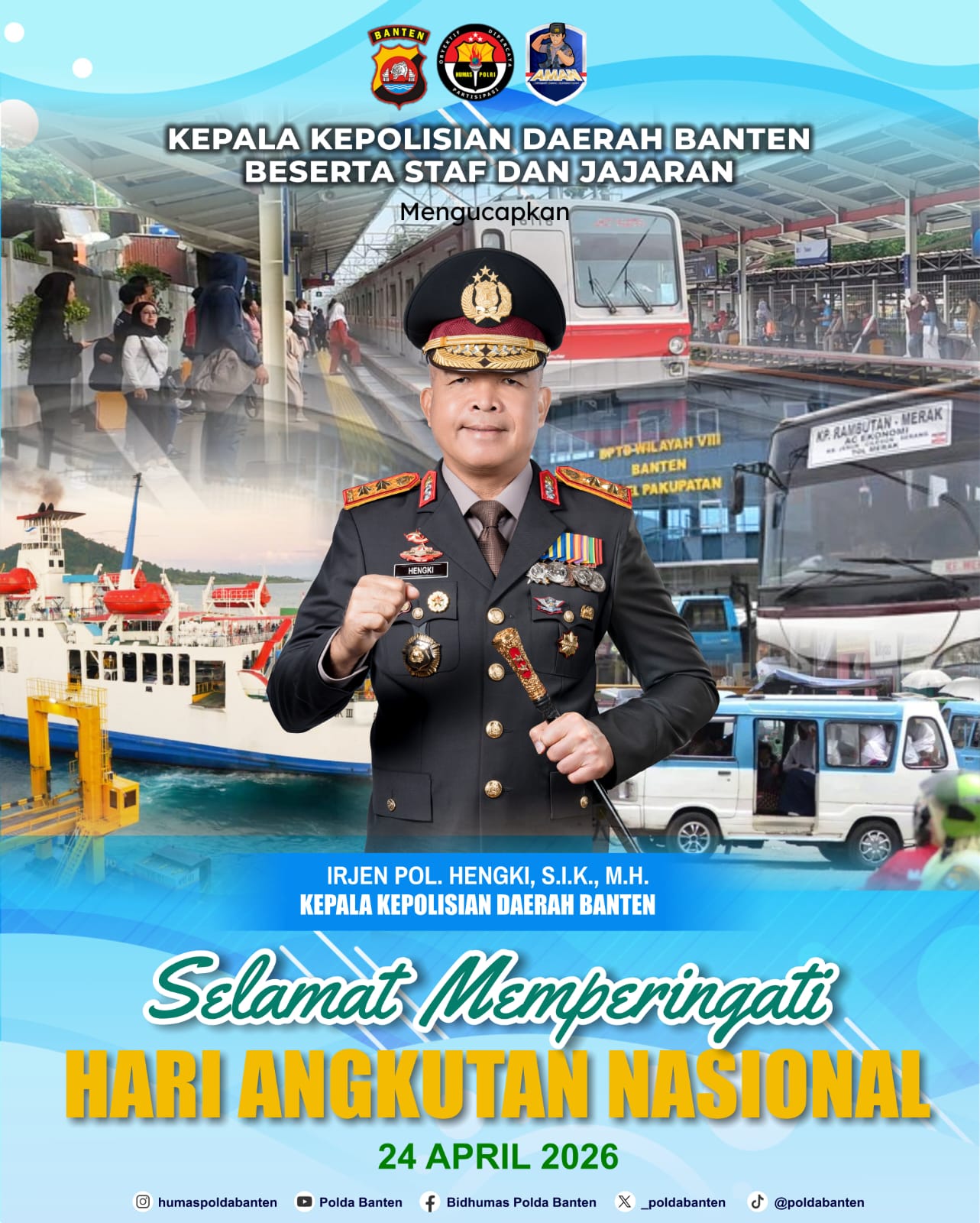 Dalam rangka memperingati Hari Angkutan Nasional yang jatuh pada 24 April 2026, Kepala Kepolisian Daerah Banten Irjen Pol. Hengki menyampaikan ucapan selamat sekaligus apresiasi kepada seluruh insan transportasi atas dedikasinya dalam menjaga kelancaran mobilitas masyarakat.