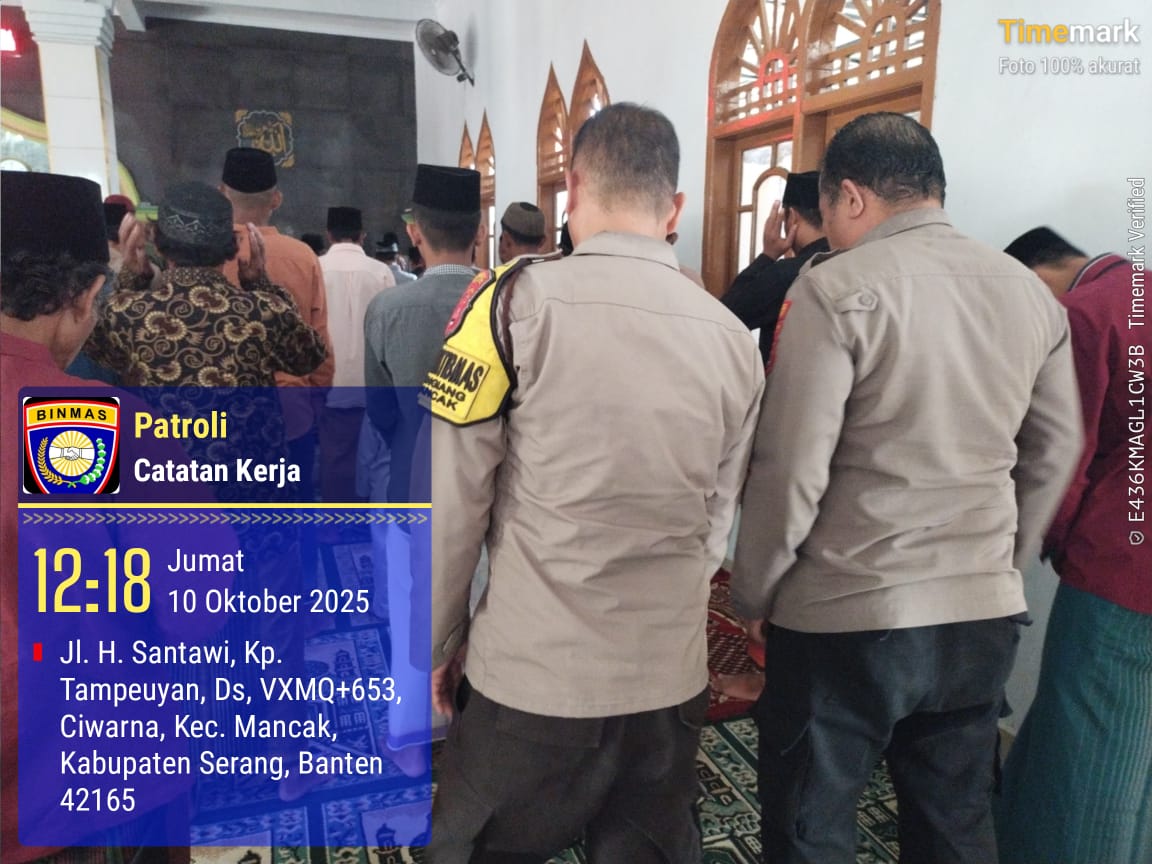 Sebagai Pengemban Fungsi Harkamtibmas, KAPOLSEK IPTU KHAIRUL Dan Bhabinkamtibmas Desa balekencana AIPDA AGUS YEYEN K, S.KOM. bersama personil polsek mancak melaksanakan sholat jumat keliling dimasjid kp. Tampeyan Desa, Balekencana serta melaksanakan giat program KAPOLRES CILEGON TRENDING dan giat program QUICK WIN PRESISI. Kabupaten Serang Kecamatan Mancak Jum’at (10/10/2025).
