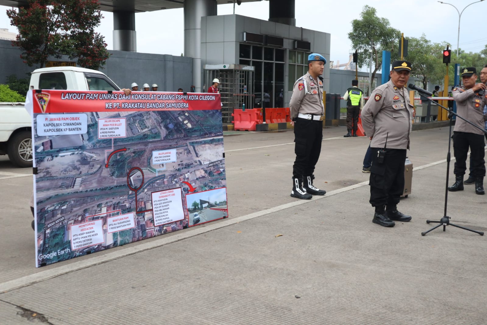 Polres Cilegon melaksanakan apel pengamanan aksi unjuk rasa yang dilakukan oleh Konsulat Cabang Federasi Serikat Pekerja Metal Indonesia (FSPMI) Kota Cilegon menuju PT Krakatau Bandar Samudera, Kegiatan pengamanan berlangsung sejak pukul 06.00 WIB hingga 18.00 WIB dan dipusatkan di kawasan PT Krakatau Bandar Samudera, Kota Cilegon. Kamis, 29/1/2026.