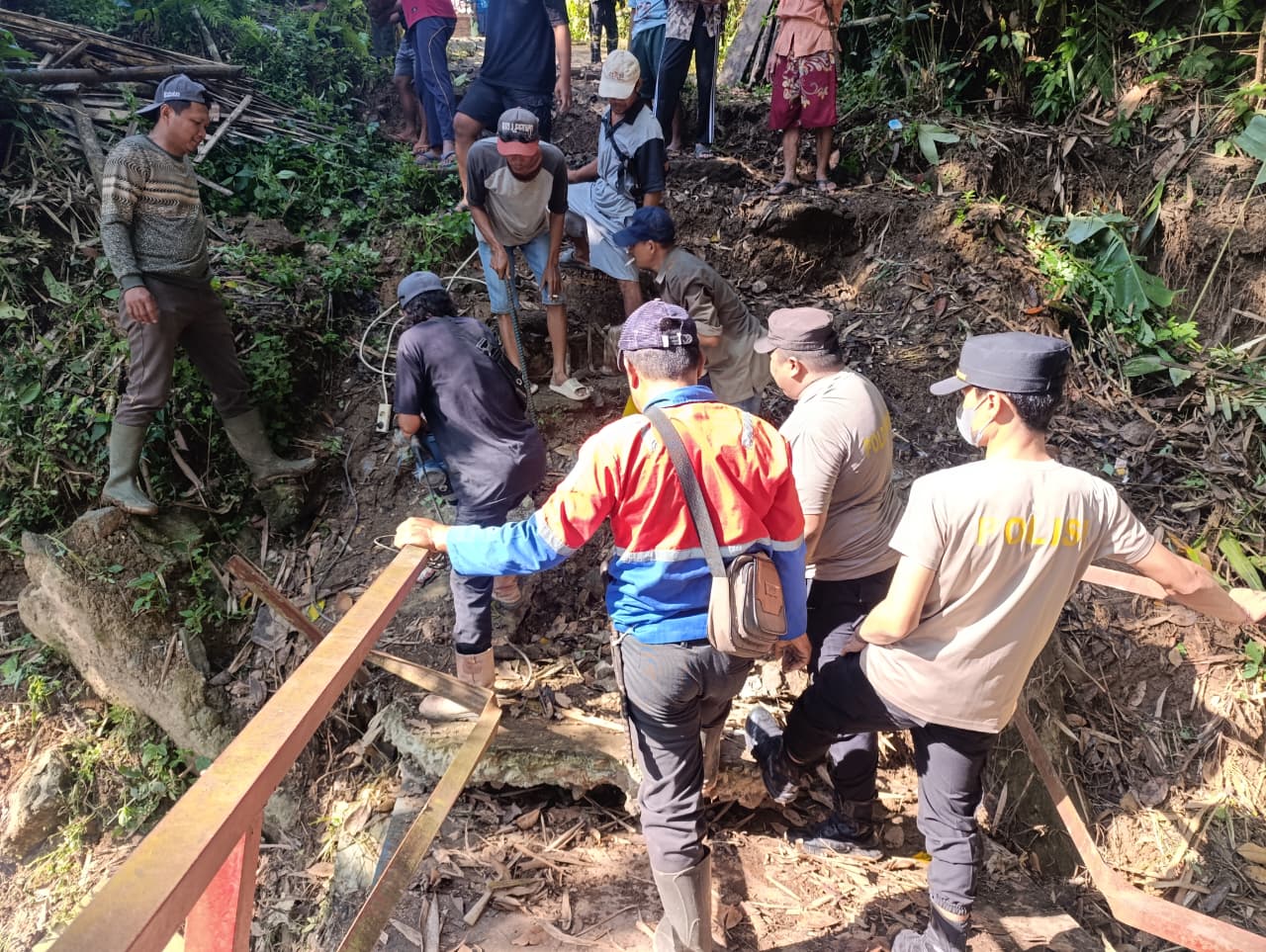 Kapolsek Rangasbitung AKP Henri Sinaga,.SH dan personel Polres Lebak bersama masyarakat Kampung Cikaduen,bergotong royong persiapan membangunan jembatan Merah Putih presisi yang akan di bangun opeh Polres Lebak Polda Banten berlokasi di Kampung Cikaduen.