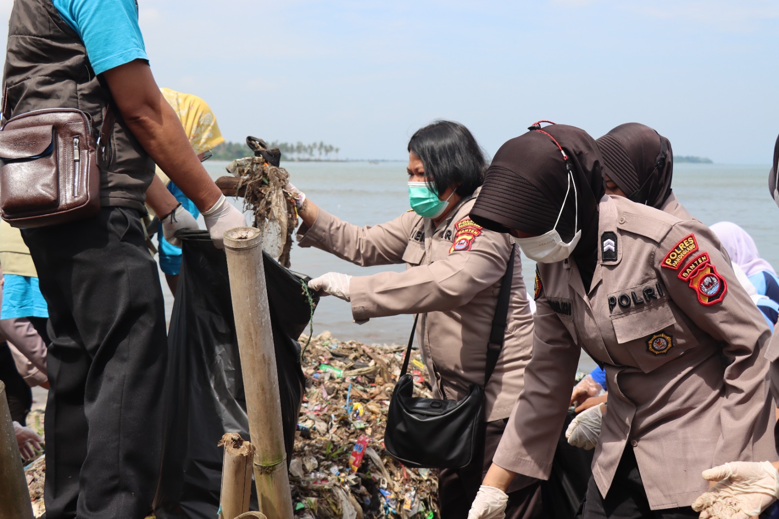 Para Polwan dari Polres Pandeglang menyatukan kekuatan dengan masyarakat setempat, relawan lingkungan, dan berbagai pihak terkait untuk membersihkan pantai dari sampah-sampah yang terdampar di sepanjang pantai.